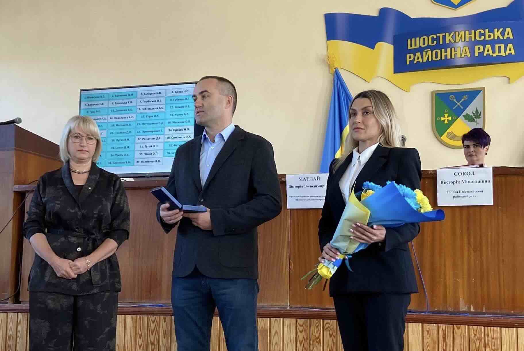Голова Сумської обласної ради Олексій Романько вручив відзнаку «За заслуги перед Сумщиною» ІІІ ступеня т.в.о. начальниці Шосткинської районної військової адміністрації Оксані Тарасюк.