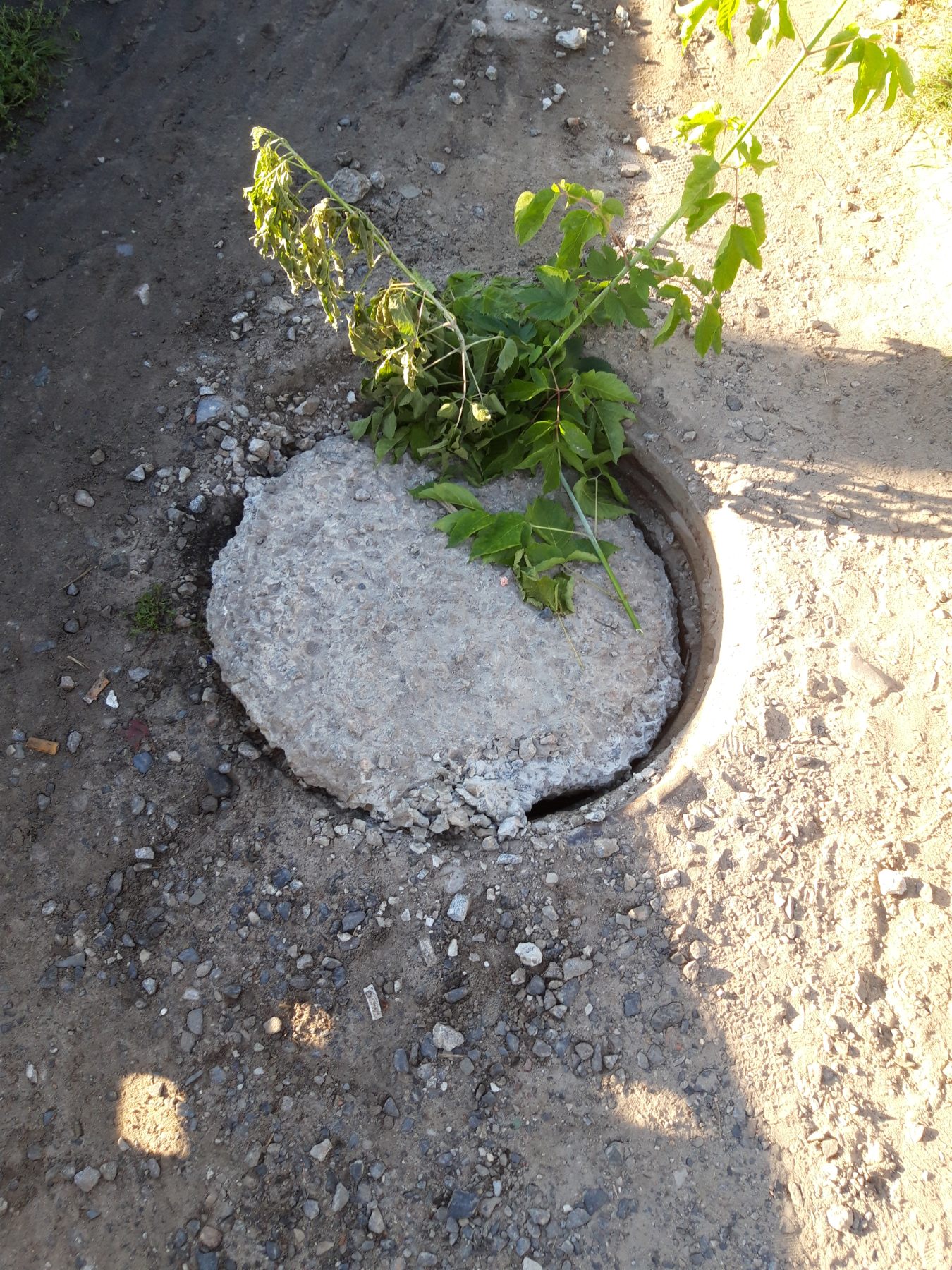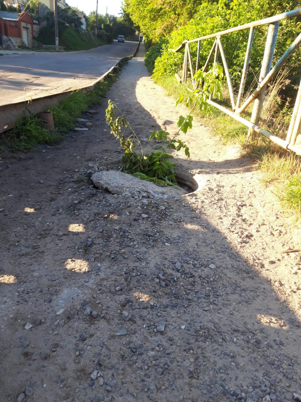 Хтось дбайливо в превентивних цілях всунув в щілину люка гілочку, позначивши таким чином небезпечне місце. Але вона, звичайно, не врятує, якщо в темряві людина оступиться і попаде в цю діру.