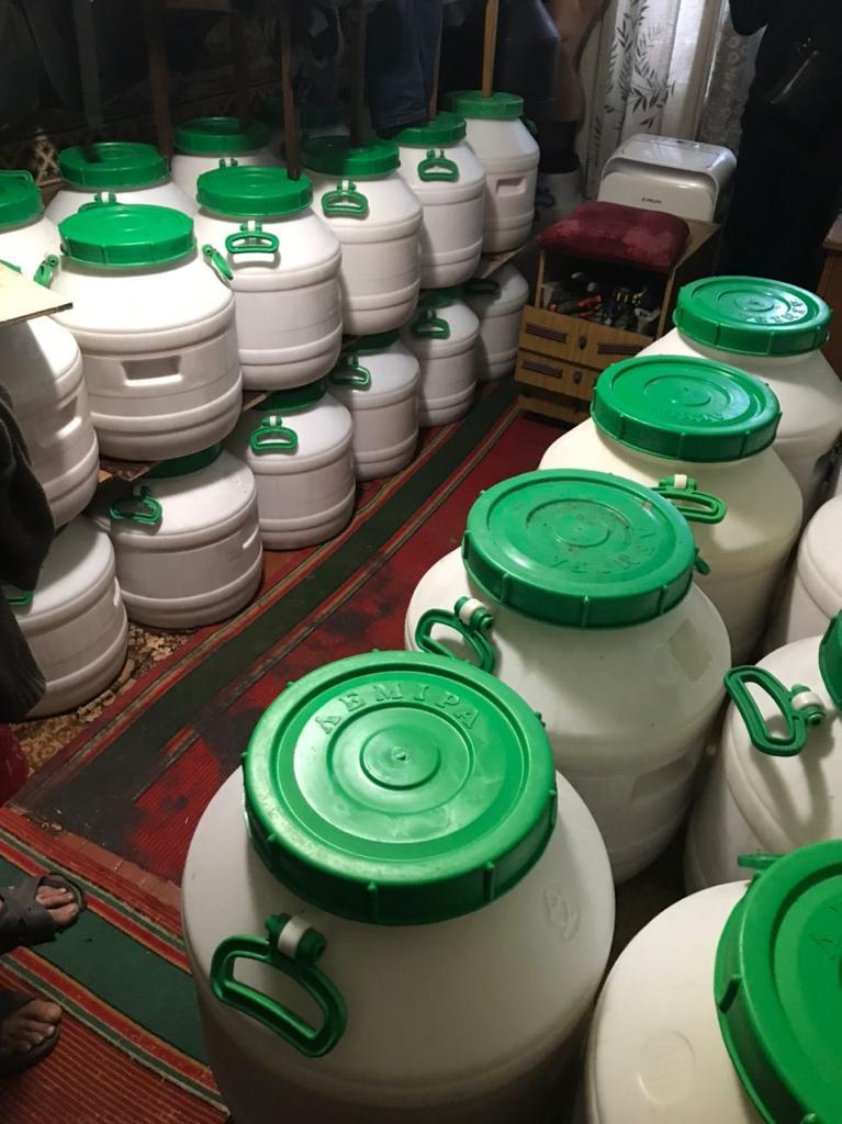 У квартирі самогонщика стражі порядку виявили десятки бочок з самогонною закваскою та рідину, схожу на самогон, а також 2 апарати для виготовлення самогону.